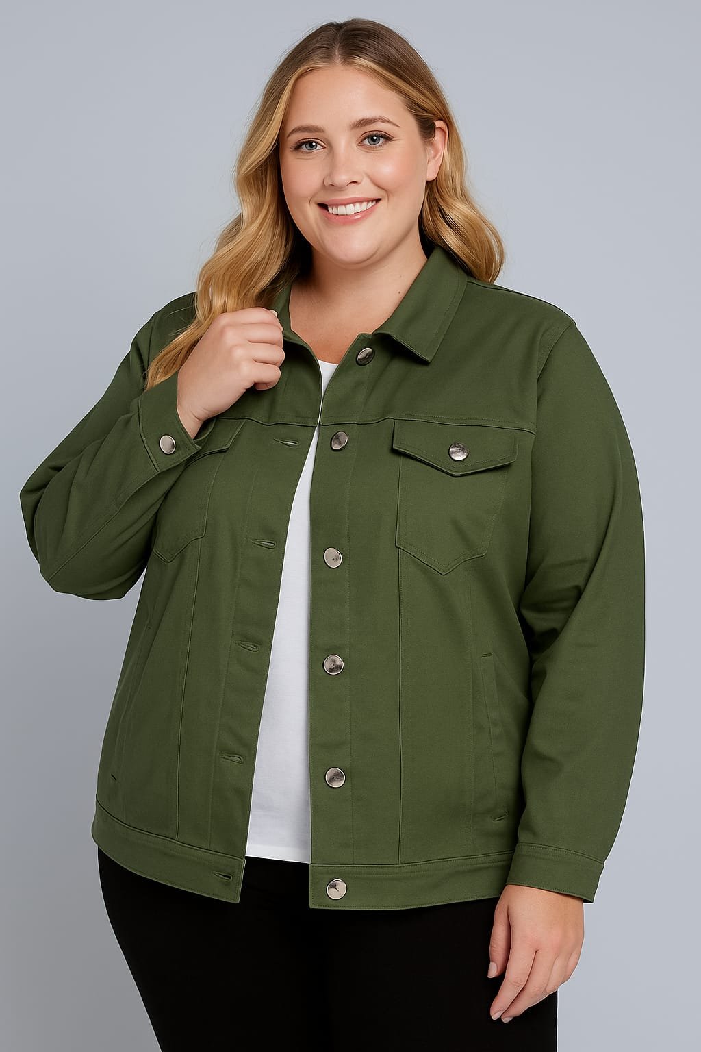 Su corte tipo jean aporta un estilo clásico y atemporal, fácil de combinar en distintas temporadas. Cuenta con botones delanteros que permiten usarla abierta o cerrada según el look, y bolsillos delanteros funcionales, sumando practicidad y un detalle de diseño que eleva la prenda.