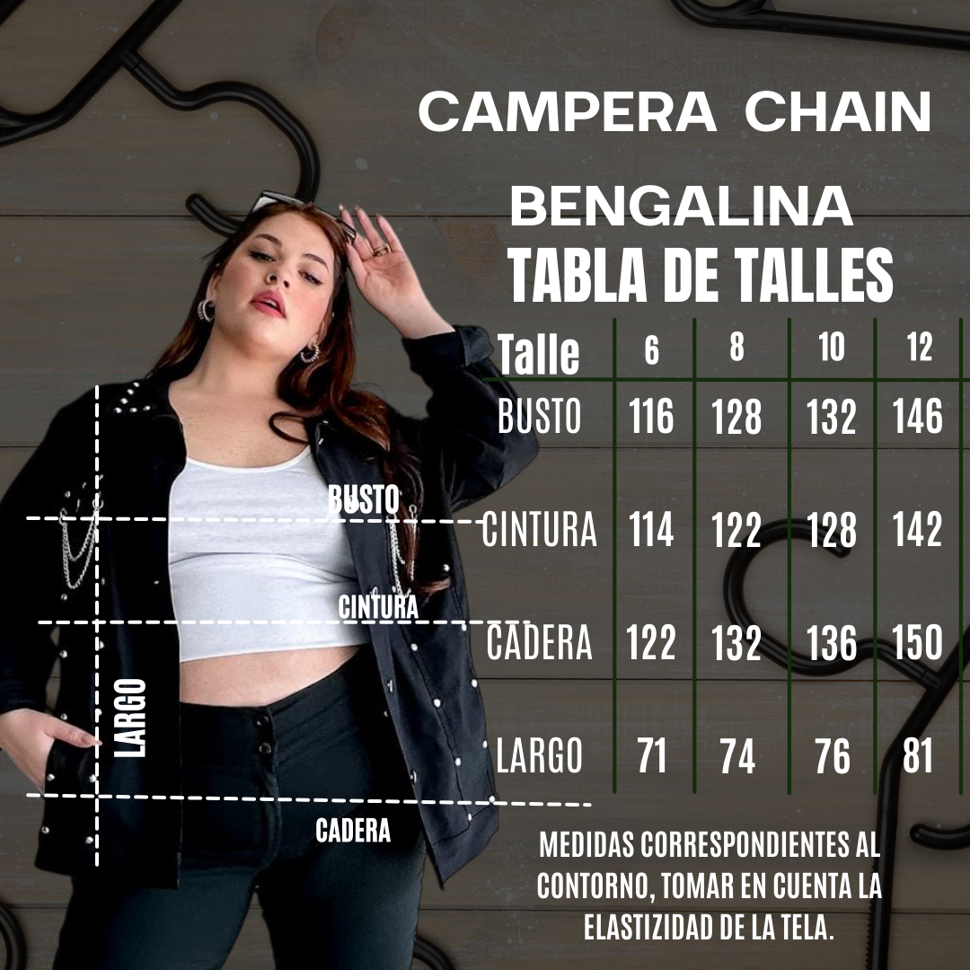 Nuestra Campera Chain de Bengalina Elastizada es una prenda protagonista, pensada para sumar actitud y estilo a looks urbanos. Confeccionada en bengalina elastizada, combina estructura y elasticidad para lograr un calce cómodo que se adapta al cuerpo sin ajustar, ideal para talles reales.