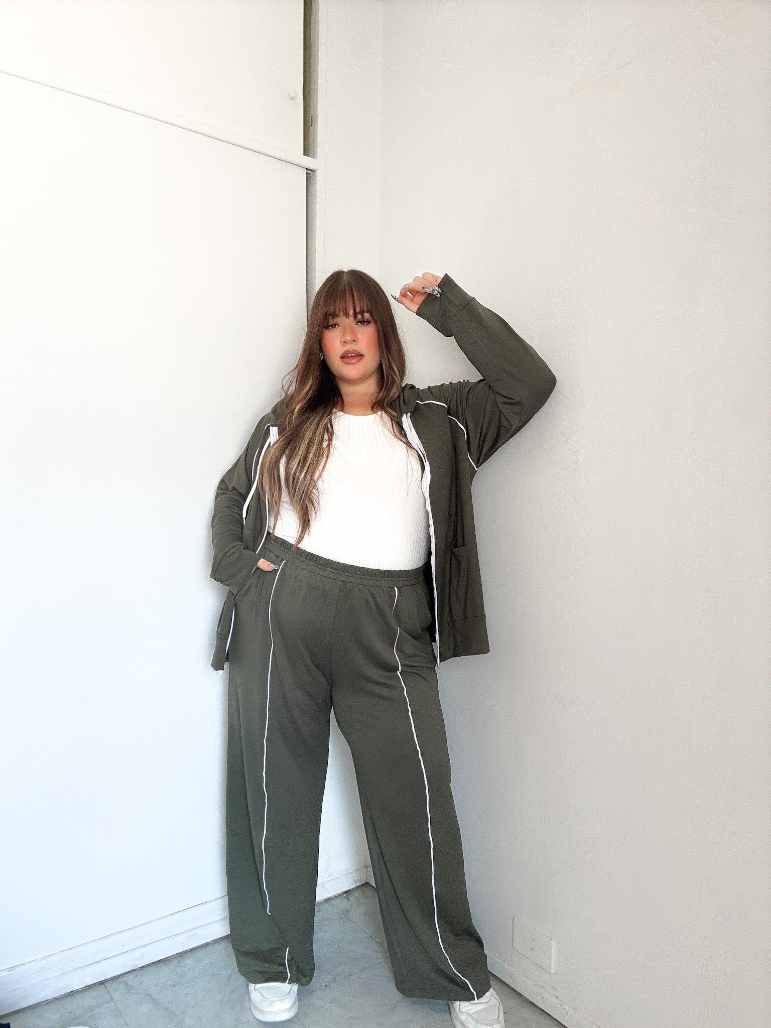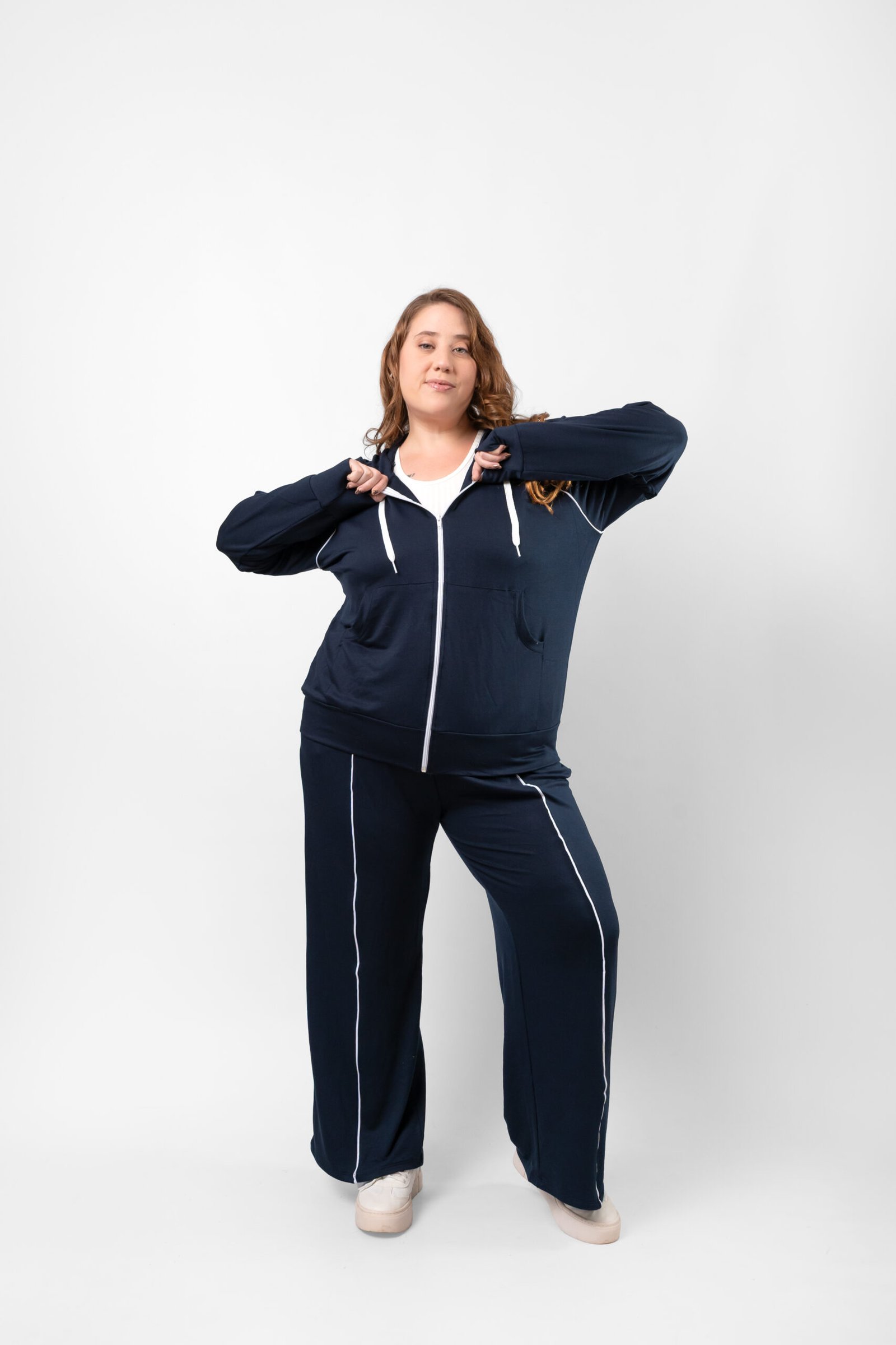 El pantalón tiene pierna amplia que aporta comodidad y movimiento, mientras que el buzo con capucha y cierre frontal completa un conjunto práctico y moderno.